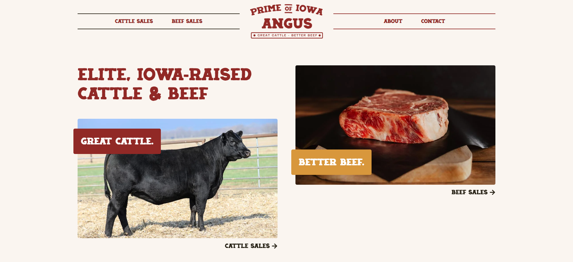 Our Solution: We created a bold, visually driven website that reflects the strength, quality, and authenticity behind the Prime of Iowa Angus brand. Designed to feel rooted in the agricultural industry while still modern and polished, the site uses strong typography, rich photography, and a rugged color palette to highlight both sides of the business; elite cattle genetics and premium Angus beef. The homepage structure clearly guides two distinct audiences, cattle producers looking to purchase genetics and meat retailers interested in high-quality beef. Dedicated sections for cattle sales and beef sales make these offerings easy to understand while keeping navigation simple and focused. Clear calls to action encourage visitors to reach out, request information, or learn more about upcoming cattle sales, creating a strong digital foundation for the newly rebranded business.